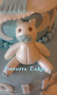 La decoración la hice en el curso de modelado de Megasilvita (visitad su blog, nunca me canso de decir que es una artistaza, aprendo muchísimo de ella y siempre está dispuesta a ayudarte, enseñarte todo lo que necesites...gracias Silvia!! http://blogolosas.com/index.php?blogId=11). Estaba deseando hacer este curso, aprendí muchos truquitos y técnicas para que los muñecos queden mejor. Y cuando vi lo bonito que quedaba el conjunto, pensé que esta tarta tenía que llevar esta decoración... Como era para una bebé le puse una florecita en la oreja al osito y ...voilá...habemus osita!